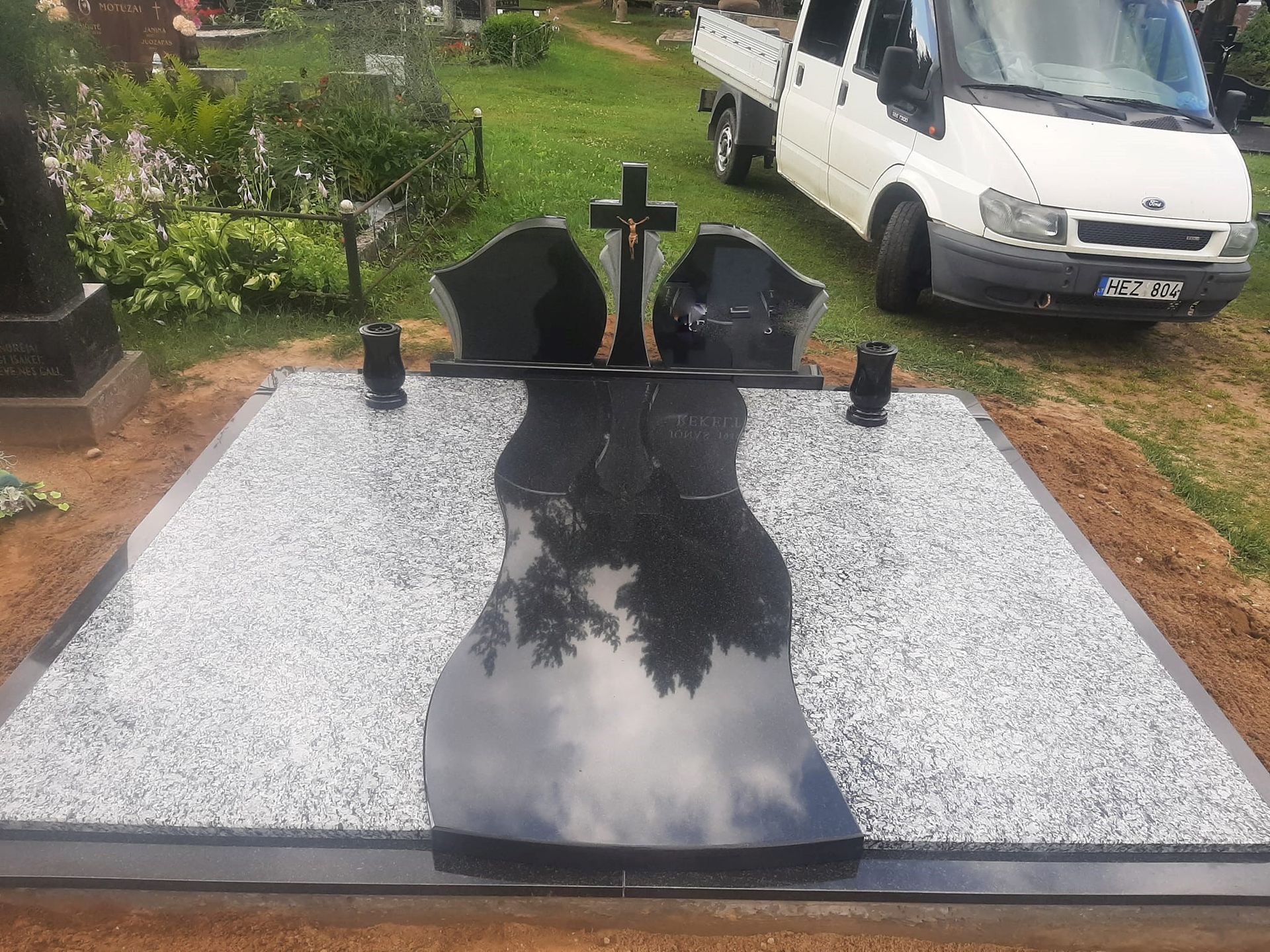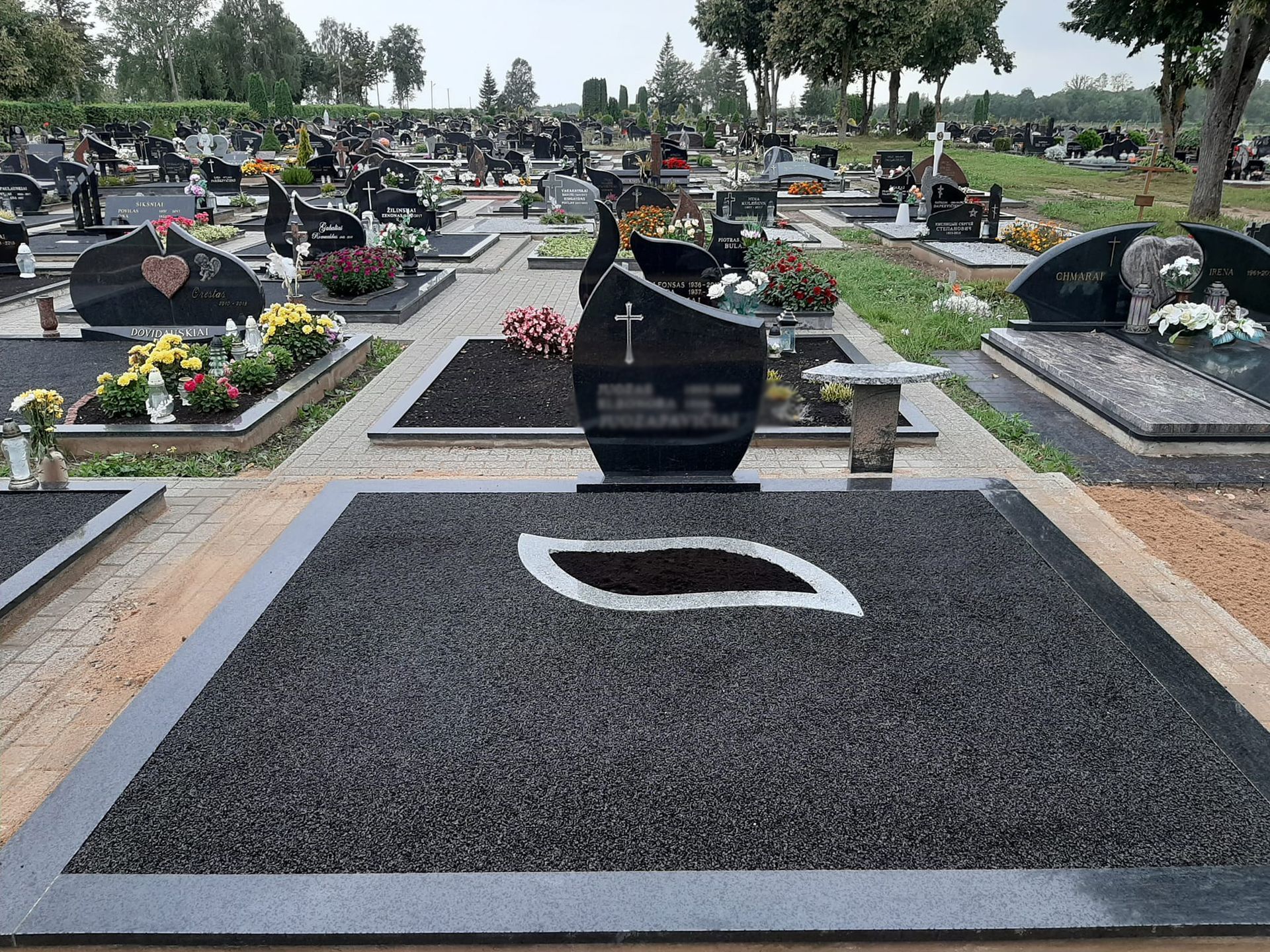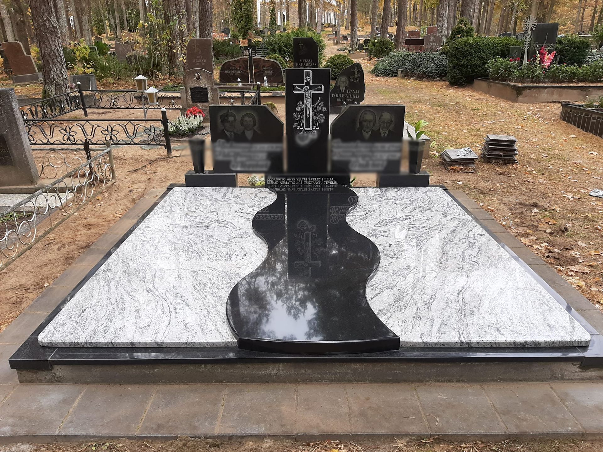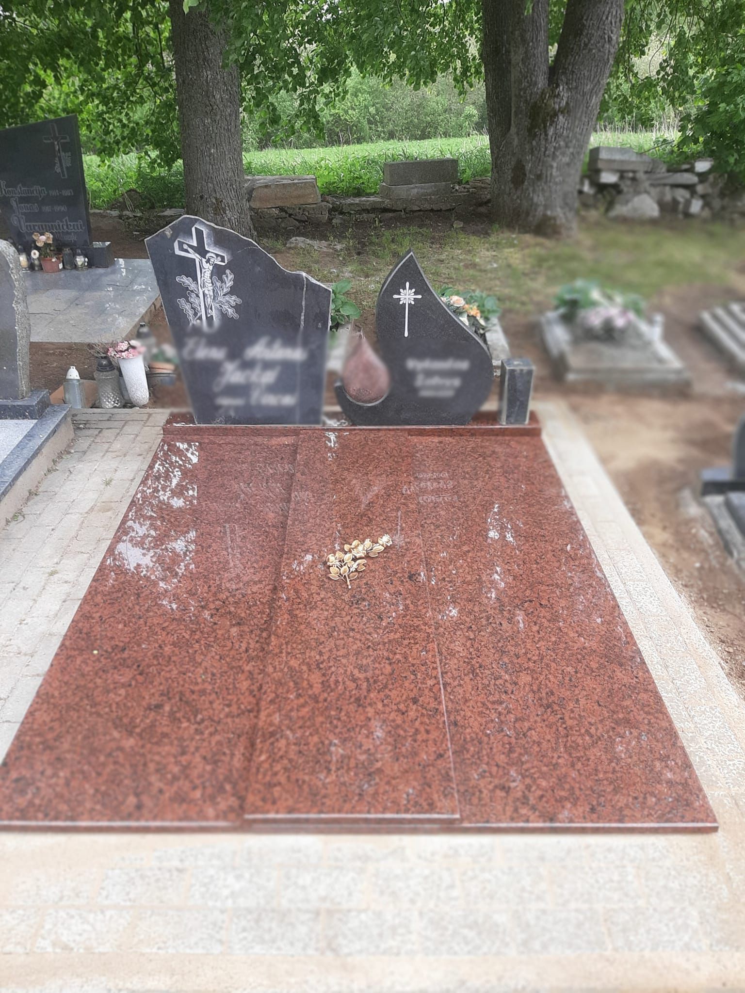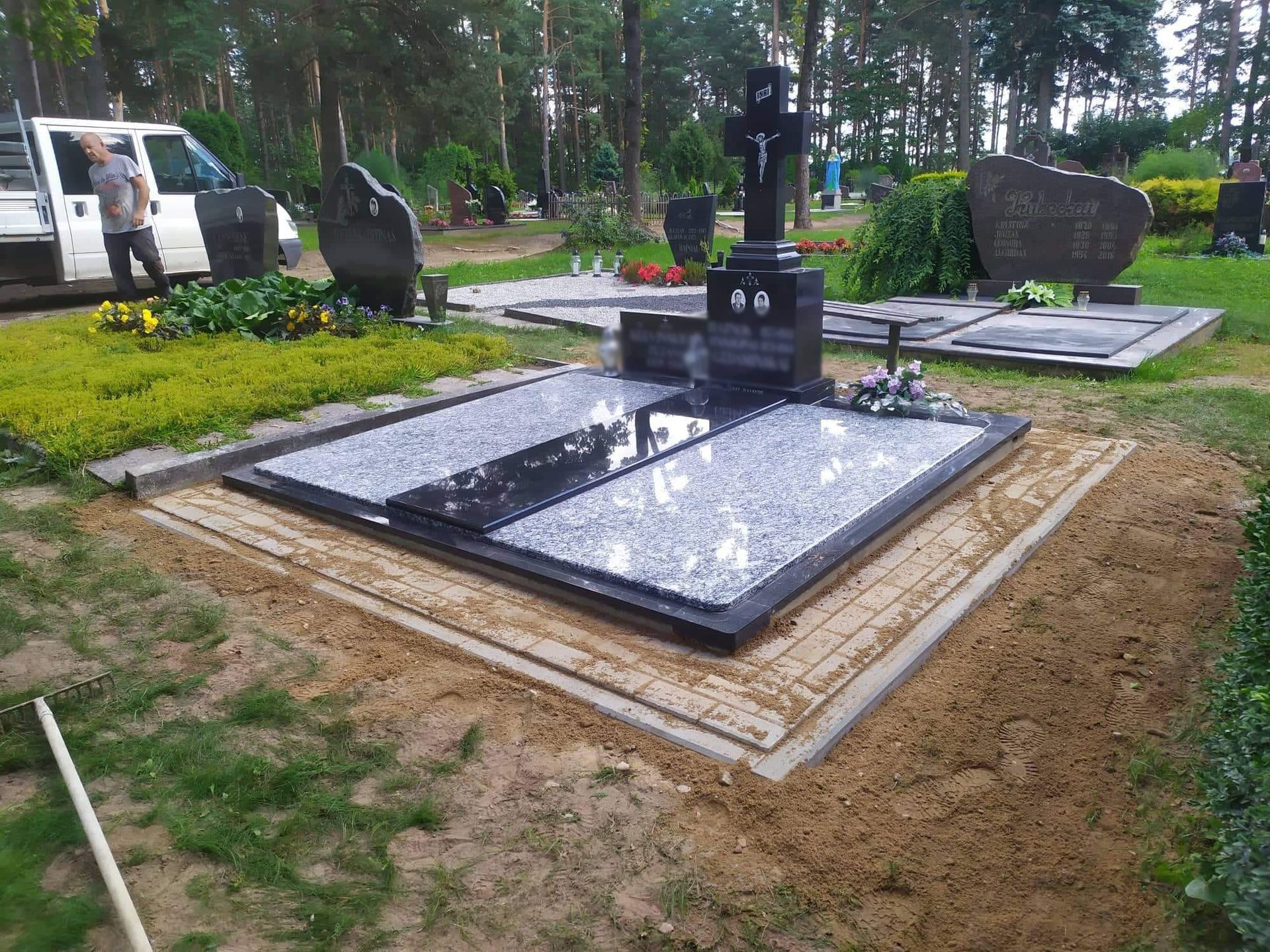 Pilnai dengiame kapavietę akmens plokštėmis arba akmens masės plytelėmis. Bortelių, paminklų gamyba, skaldos išpylimas, trinkelių klojimas aplink kapą ir kiti kapų įrengimo darbai. Taip pat teikiame pamatų liejimo paslaugas.
