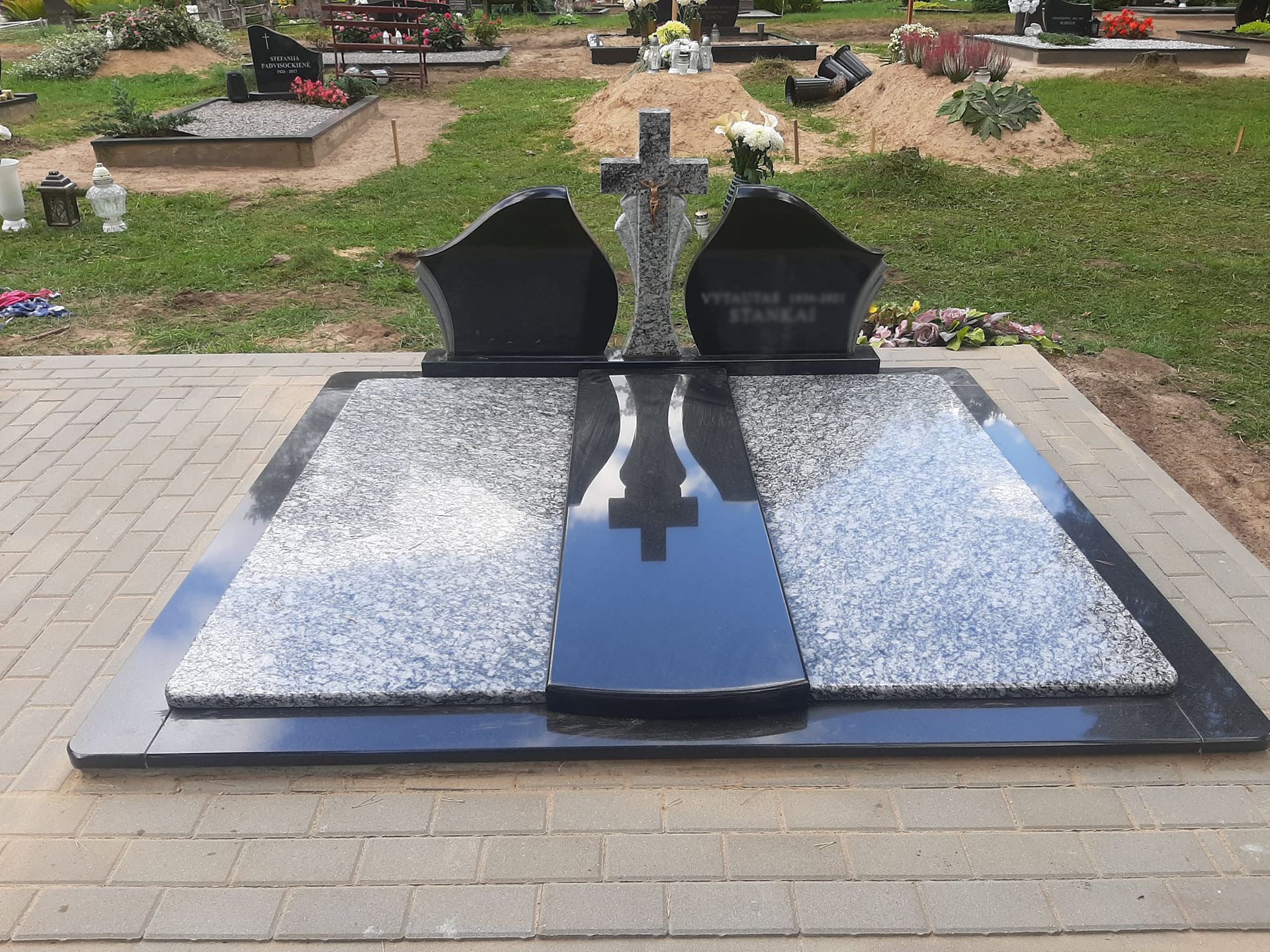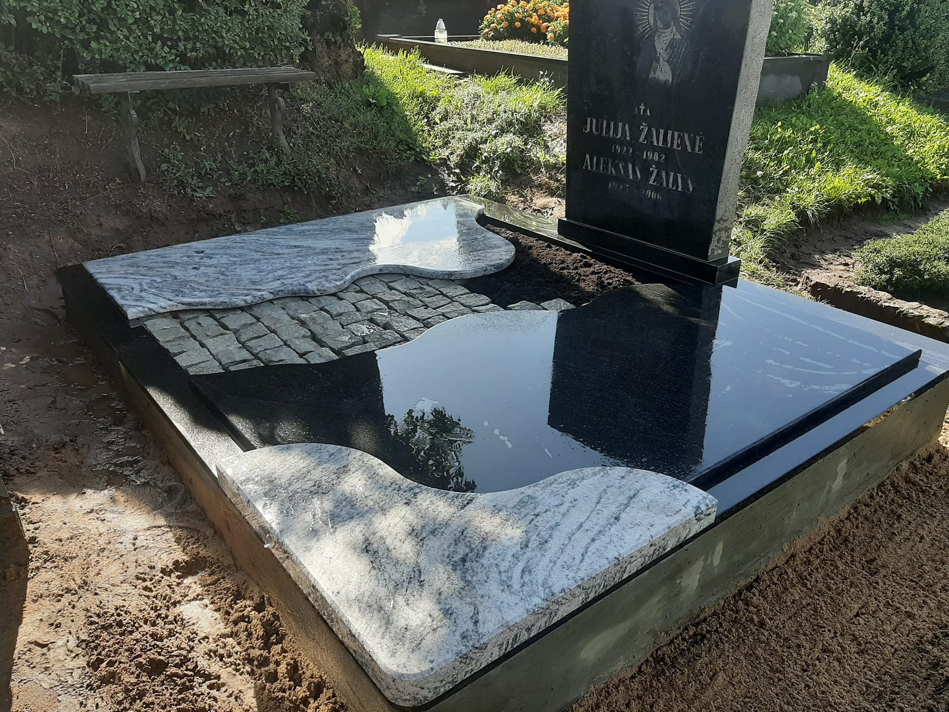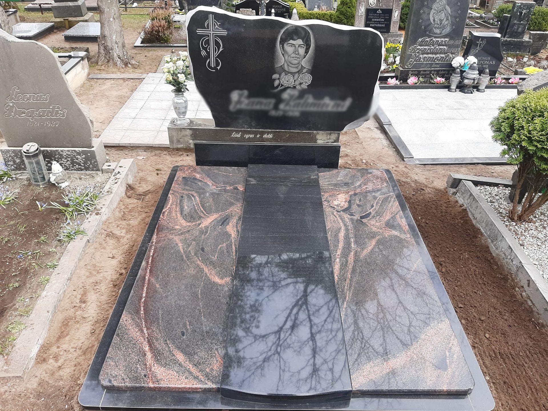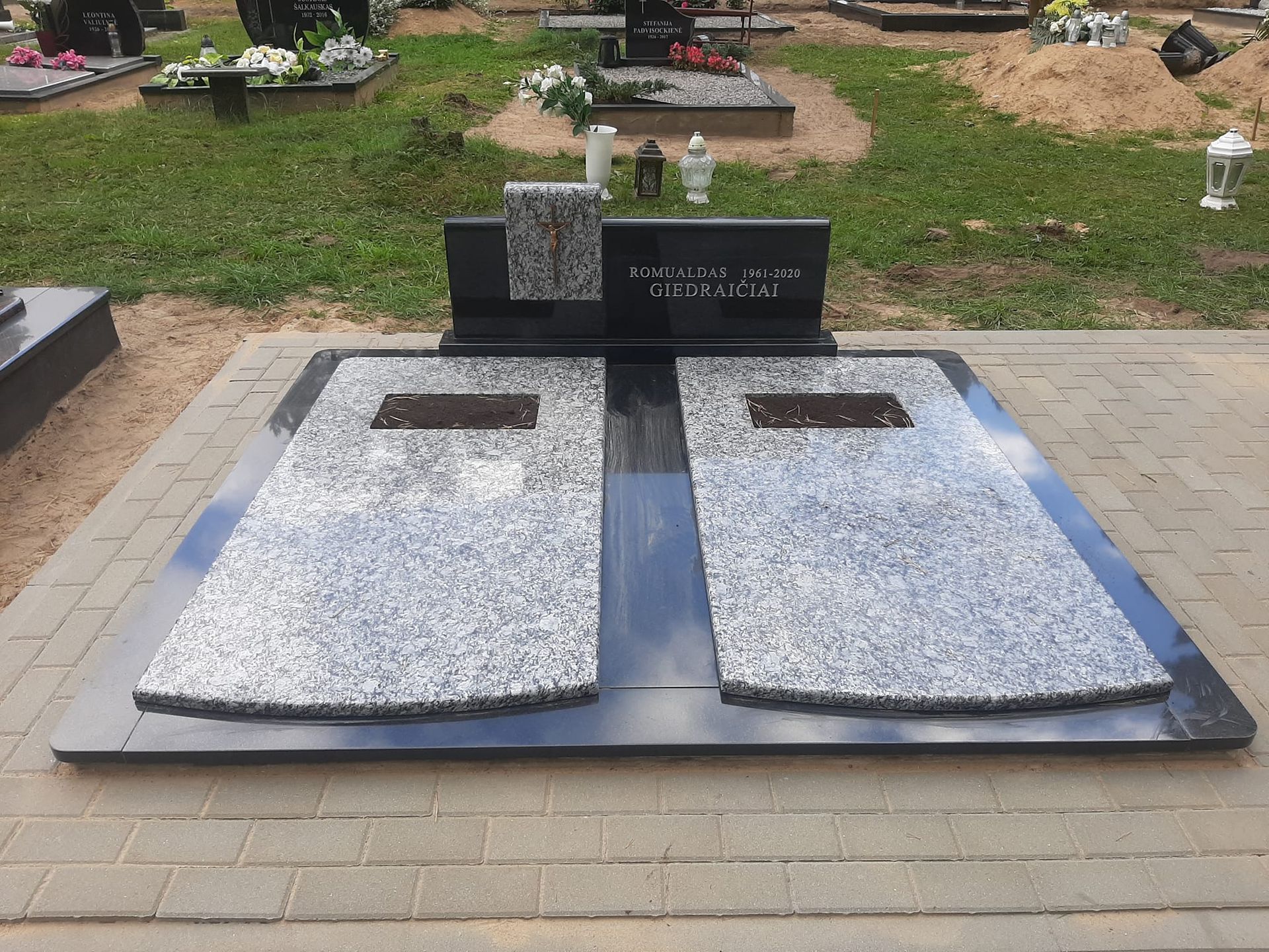 Pilnai dengiame kapavietę akmens plokštėmis arba akmens masės plytelėmis. Bortelių, paminklų gamyba, skaldos išpylimas, trinkelių klojimas aplink kapą ir kiti kapų įrengimo darbai. Taip pat teikiame pamatų liejimo paslaugas.