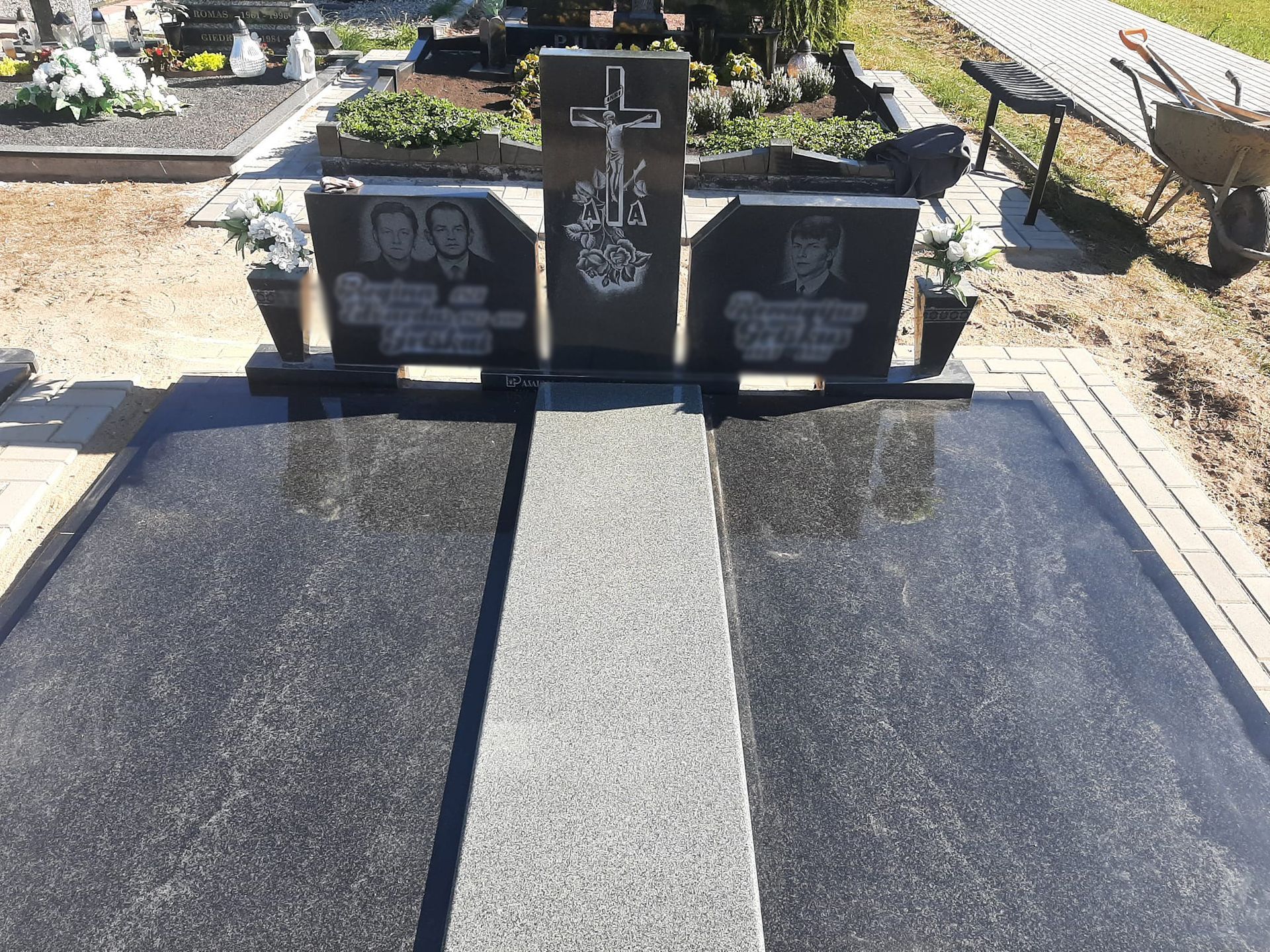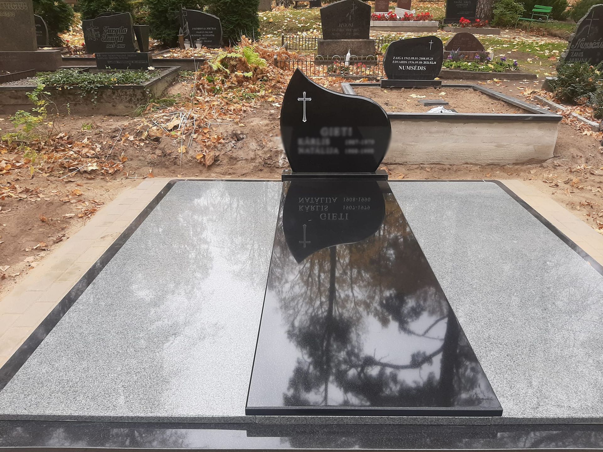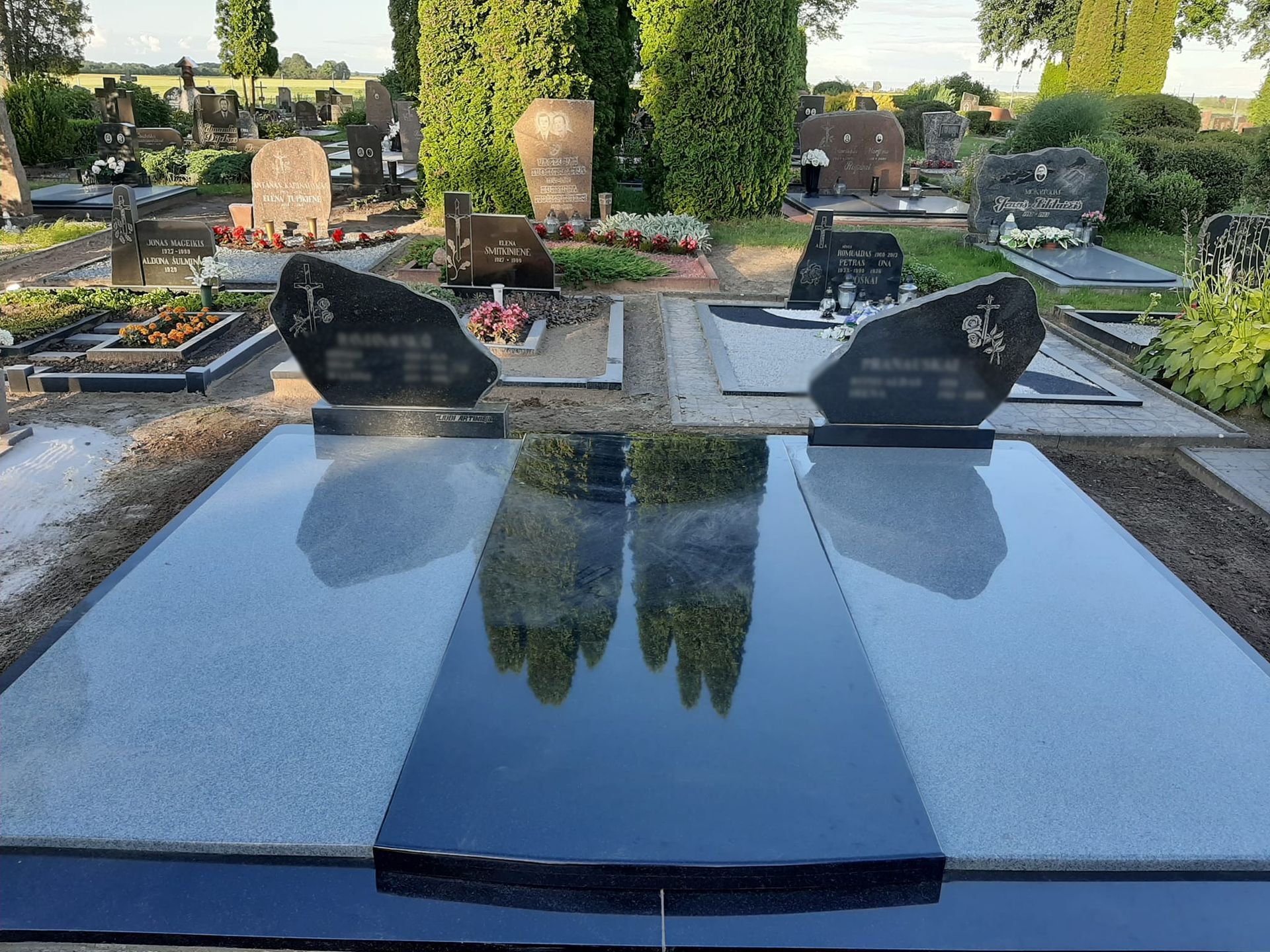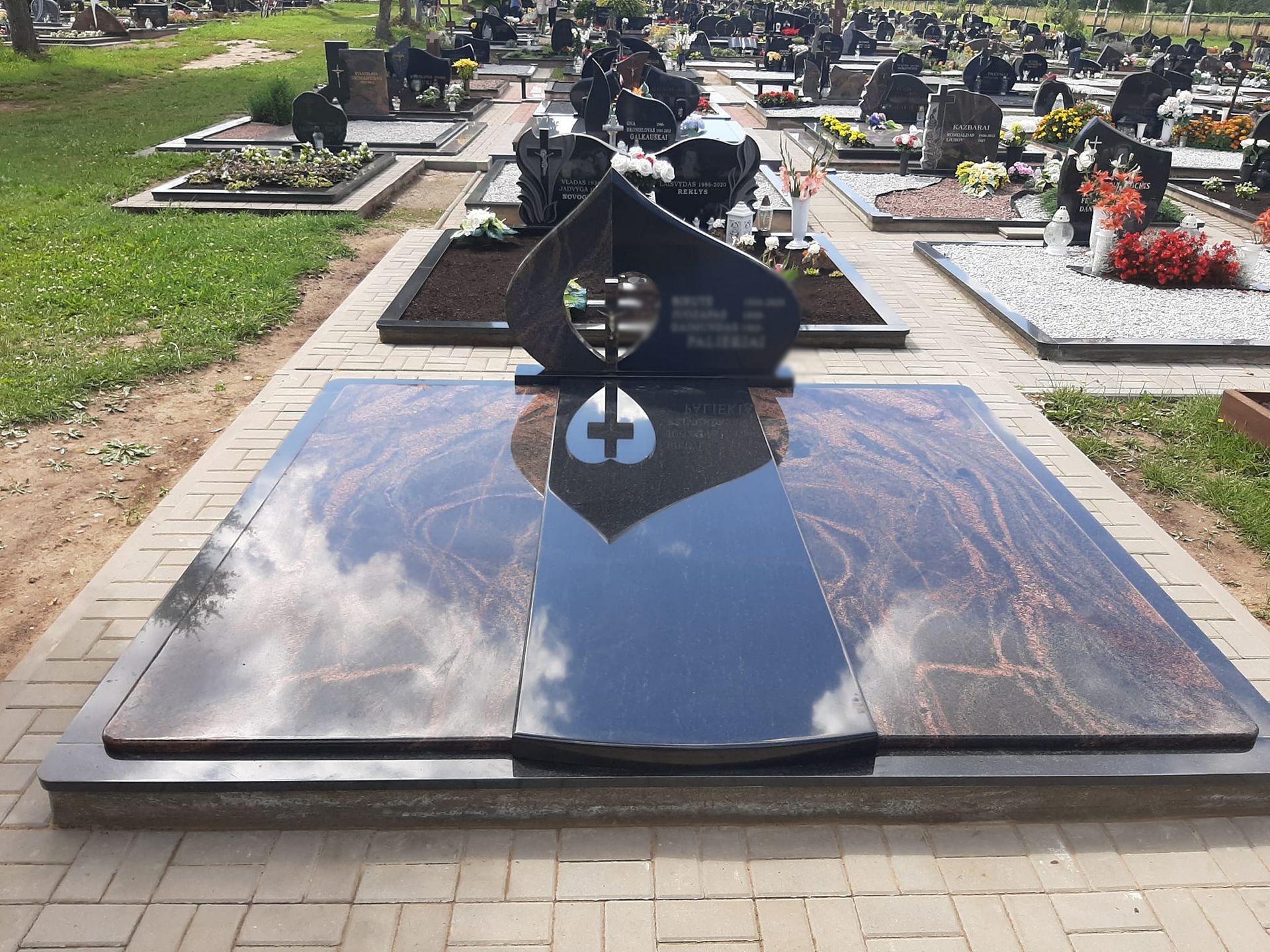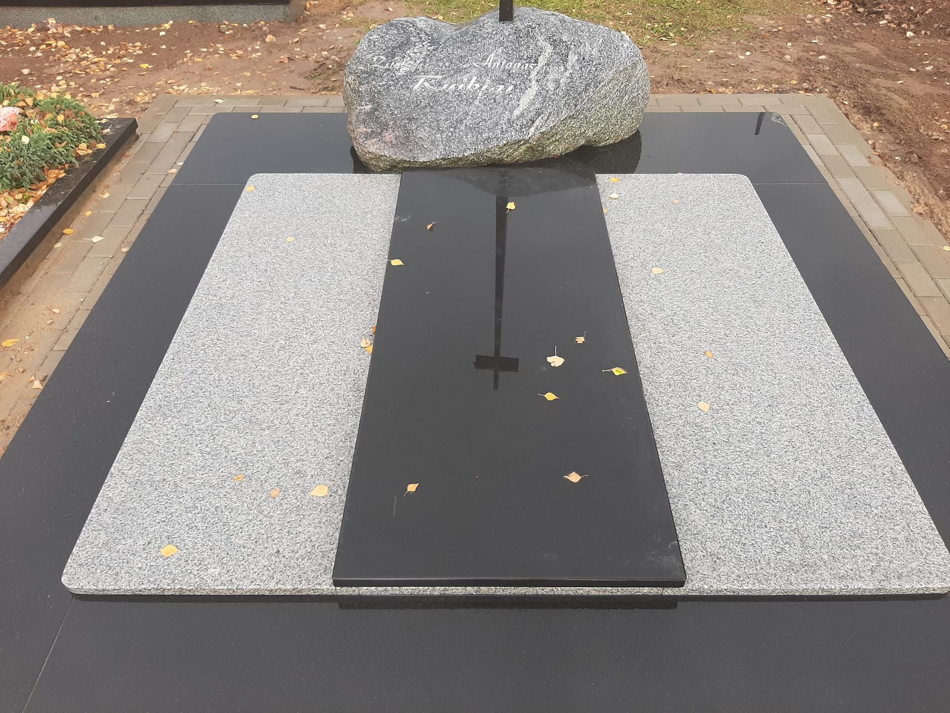 Pilnai dengiame kapavietę akmens plokštėmis arba akmens masės plytelėmis. Bortelių, paminklų gamyba, skaldos išpylimas, trinkelių klojimas aplink kapą ir kiti kapų įrengimo darbai. Taip pat teikiame pamatų liejimo paslaugas.