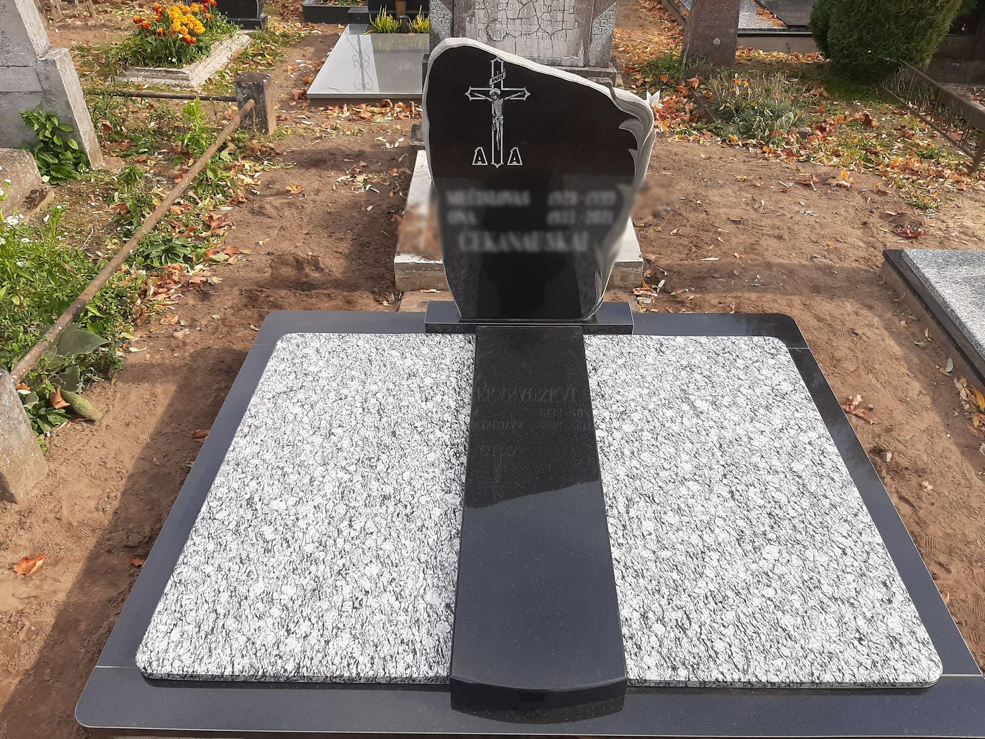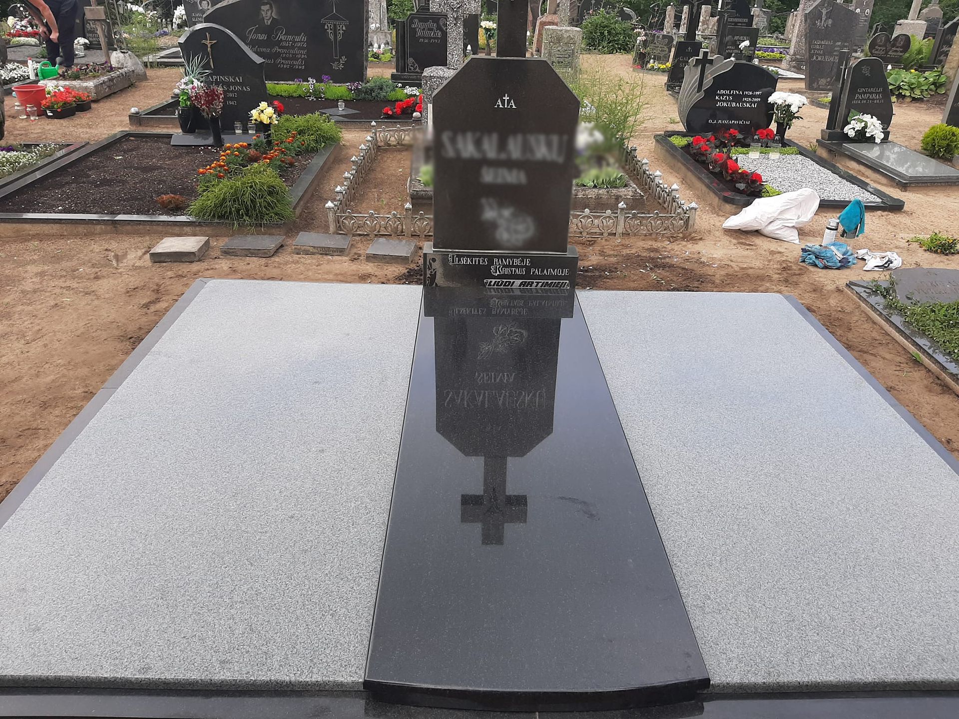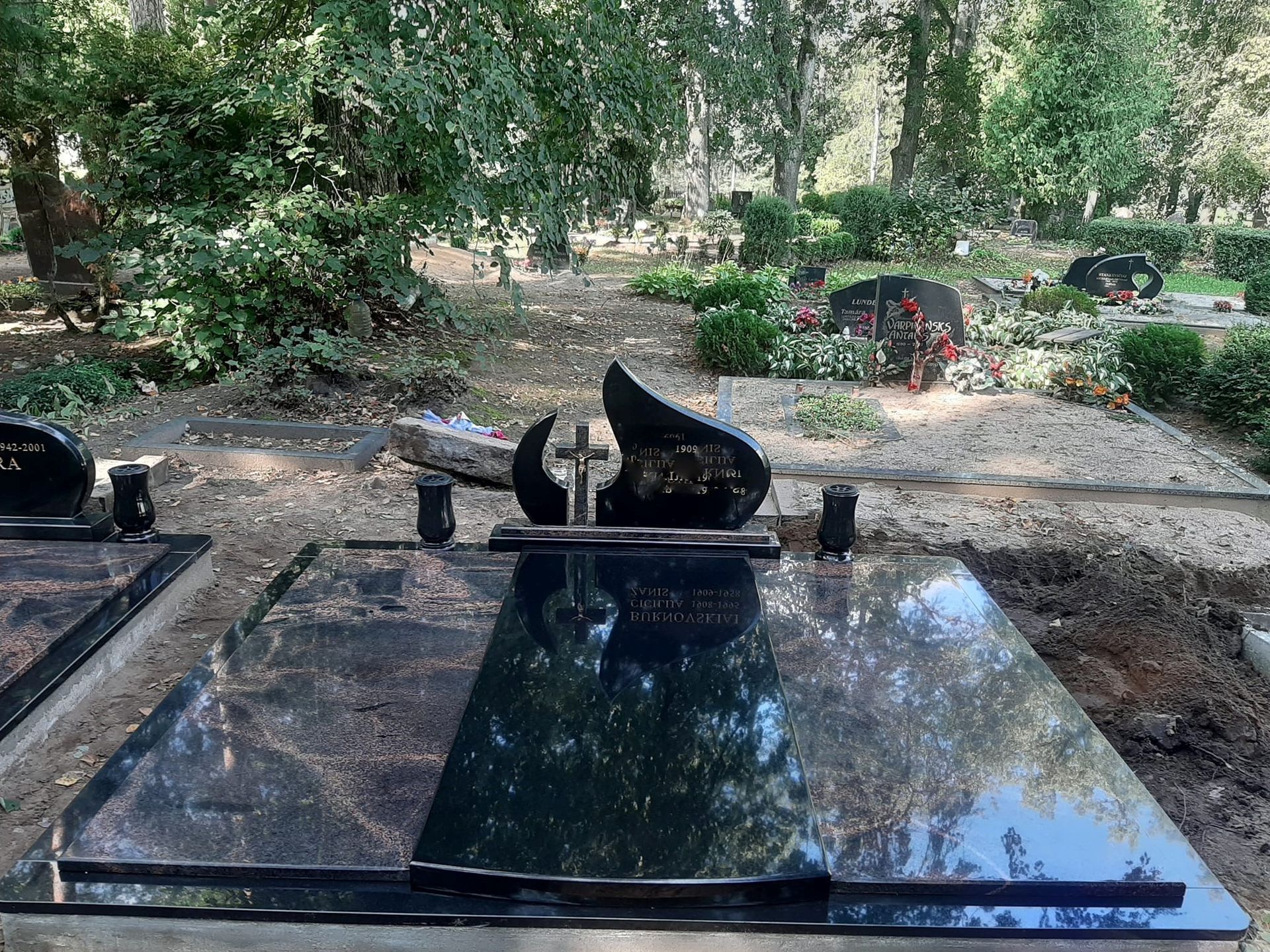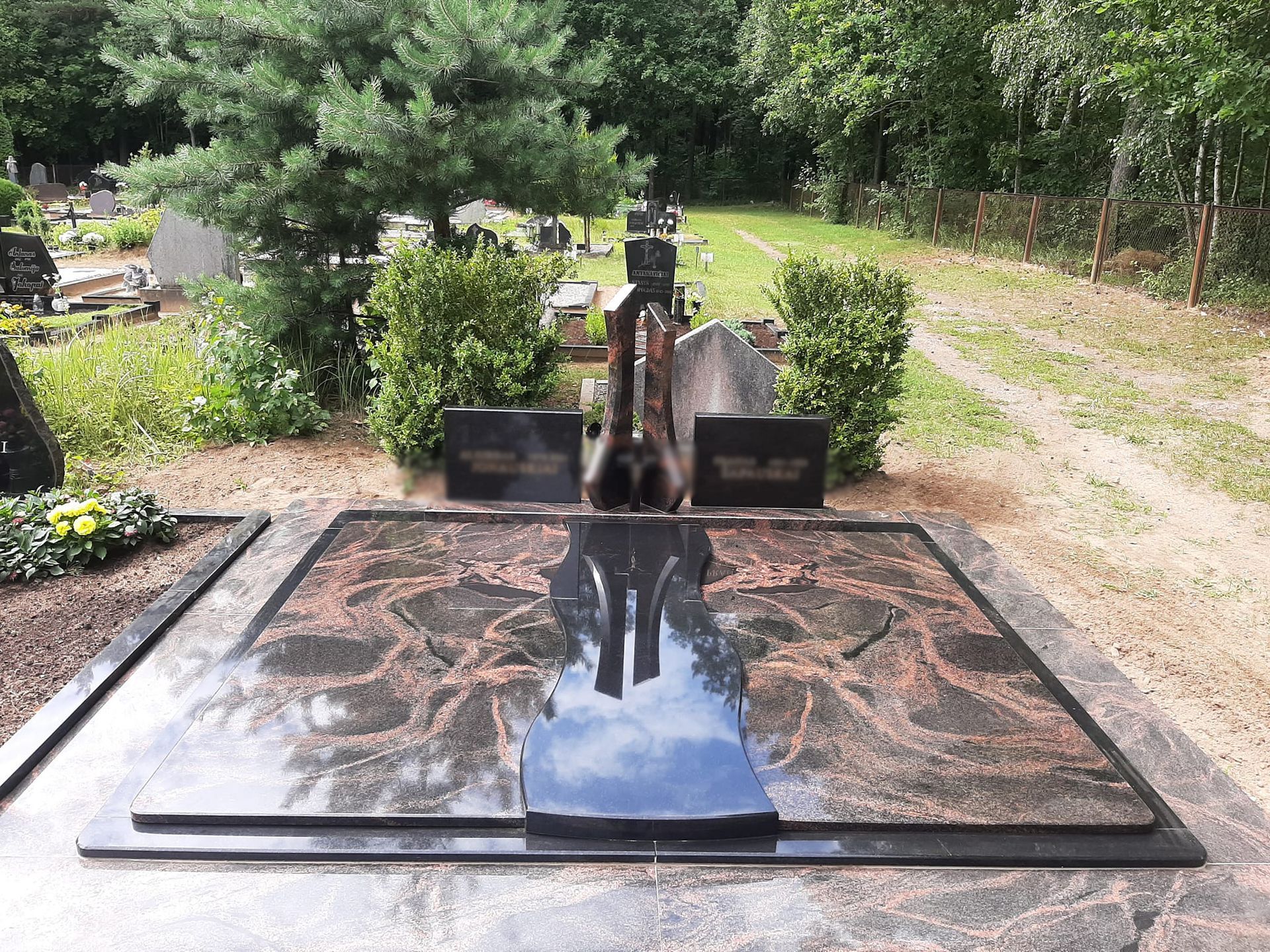 Pilnai dengiame kapavietę akmens plokštėmis arba akmens masės plytelėmis. Bortelių, paminklų gamyba, skaldos išpylimas, trinkelių klojimas aplink kapą ir kiti kapų įrengimo darbai. Taip pat teikiame pamatų liejimo paslaugas.